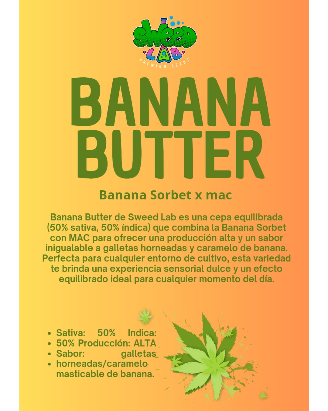 Banana Butter de Sweed Lab es una joya cannábica que equilibra a la perfección la genética de sativa e índica, ofreciendo una experiencia completa para los sentidos. Esta variedad es el resultado de una cuidadosa cruza entre Banana Sorbet y MAC (Miracle Alien Cookies), dos cepas reconocidas por su potencia y perfil de sabor excepcional.