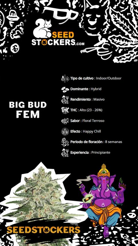 Big Bud es una de las productoras más altas de la colección de Seed Stocker; esta variedad productiva y potente fue creada específicamente para las flores XL con niveles de THC consistentemente altos. La genética Big Bud es una línea genética establecida, lo que significa un crecimiento constante de un cultivo a otro. Debido al tamaño de los cogollos y al riesgo de moho, esta variedad se desarrolla mejor en cuartos de cultivo donde la humedad no sea demasiado alta. Las pruebas de laboratorio han demostrado que Seed Stockers Big Bud tiene niveles de THC superiores al 22 %; lograr cosechas XL no significa comprometer los niveles de calidad. Recomendada, especialmente para el cultivador más experimentado que puede llevar la genética al límite.
