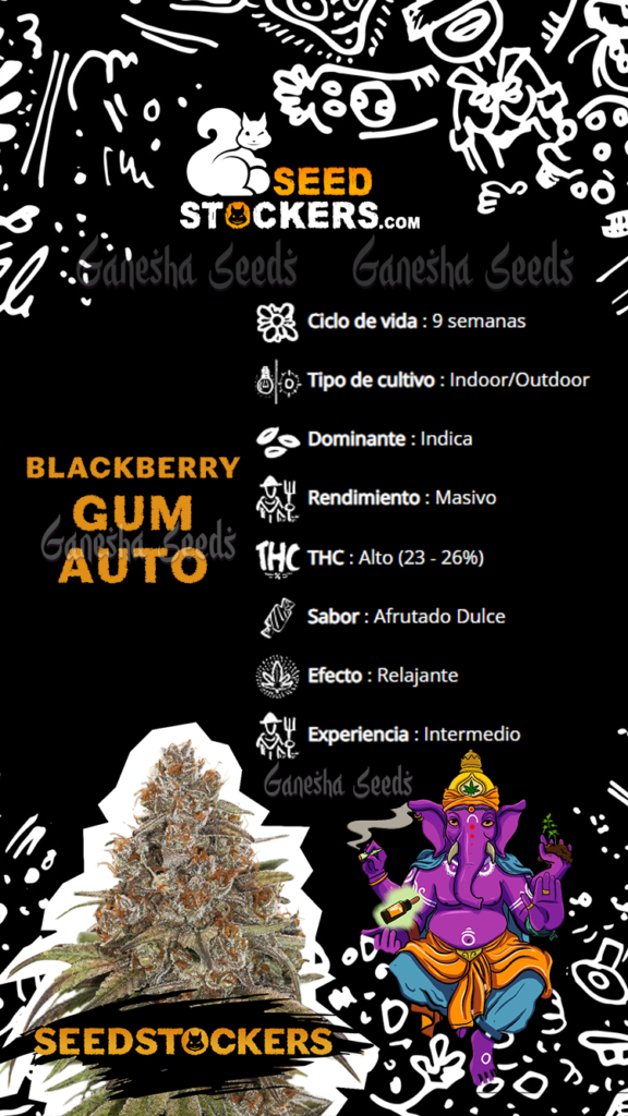 Blackberry Gum Auto es una de las mejores auto que hemos visto, con un sabor afrutado y un aroma a juego. Blackberry Gum auto será la primera en alcanzar la noche, es de un humo muy potente que alcanza niveles de THC del 22%+. Los brotes son coloridos y atractivos, a menudo en tonalidades azules, junto con un potente y profundo aroma y un golpe rápido alto. Produce sensación de bienestar, relajante y anti- ansiedad con un efecto de larga duración. Es apta para crecer en interior o exterior, madura bien en ambos métodos.