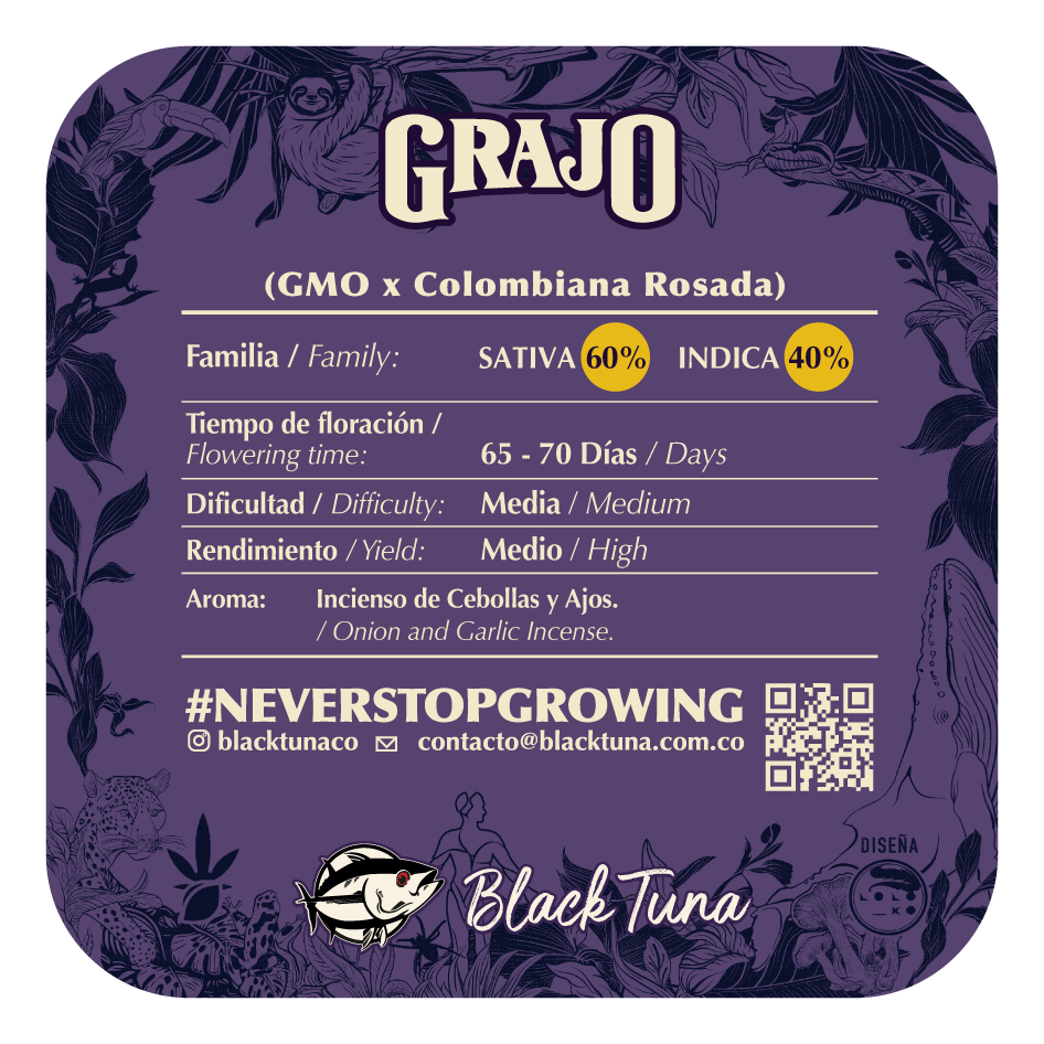 Descubre Grajo, la nueva semilla de cannabis regular lanzada por Black Tuna dentro de su exclusiva línea Biodiversidad. Esta genética, resultado del cruce entre GMO y Colombiana Rosada, ofrece una experiencia mayormente sativa que atraerá tanto a cultivadores novatos como experimentados.