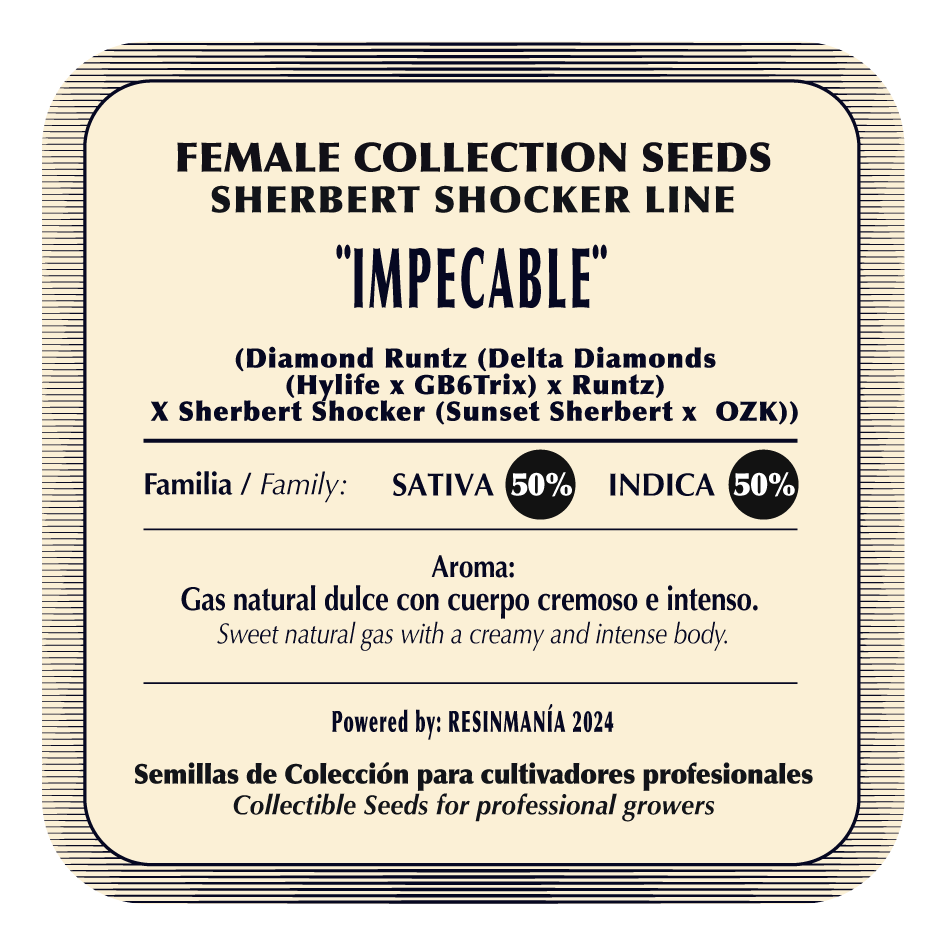 El resultado es una genética que no solo impresiona visualmente, sino que también ofrece un aroma y una experiencia sensorial de lujo. Su perfil aromático mezcla notas de caramelo dulce con matices frutales y cremosos que deleitan los sentidos desde el primer momento. Cada semilla de Impecable está diseñada para ofrecer características consistentes, lo que la convierte en una elección destacada para coleccionistas exigentes.
