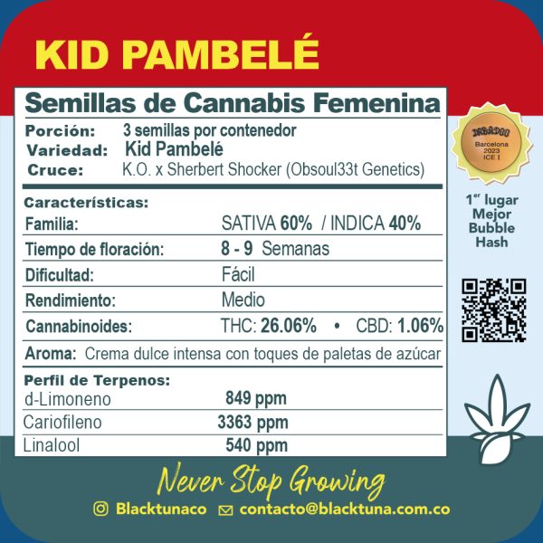 En honor a uno de los boxeadores colombianos más importantes, Antonio Cervantes, más conocido como Pambelé. La unión de nuestra selección de la poderosa K.O y nuestra selección de Sherbert Shocker del famoso Wizard of Obs, hacen de este cruce una maravilla. Plantas de floración rápida de 7-8 semanas, perfecta para SCROG y plantas madres ya que su estructura de arbusto permite un manejo agronómico fácil. Es excelente para época de verano y la reina de la extracción ¡No te pierdas esta joya que une a lo mejor de ambos mundos!