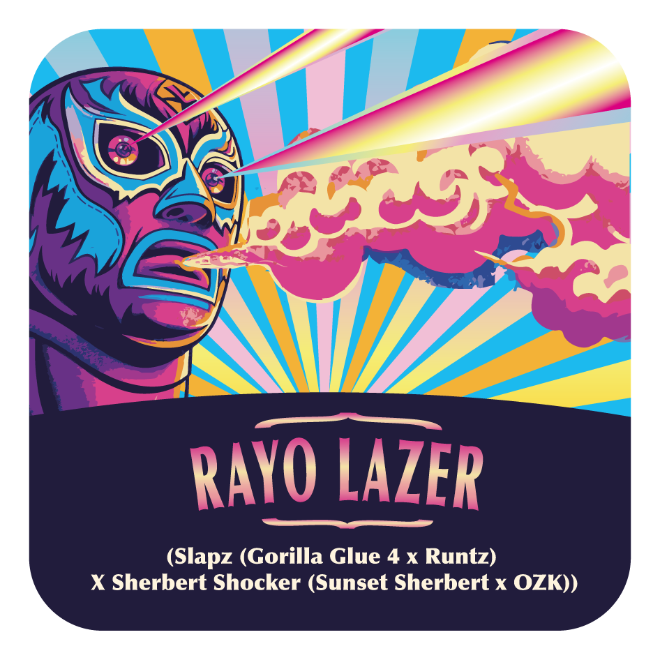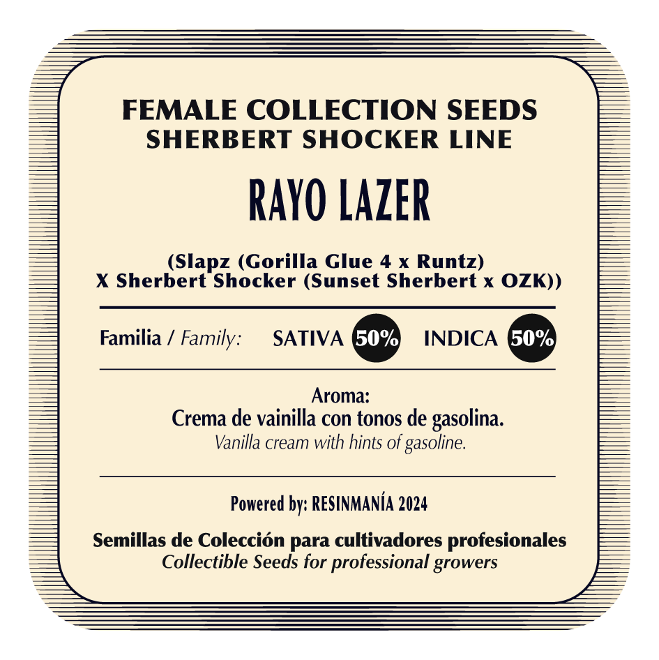 Rayo Lazer es una genética electrizante creada por Black Tuna Seeds, diseñada para aquellos coleccionistas que buscan genéticas de alta calidad con un perfil único y cautivador. Este impresionante cruce combina la audacia intensa de Slapz (Gorilla Glue 4 x Runtz), conocida por su vigor y producción de resina, con el perfil suave y vibrante de Sherbert Shocker (Sunset Sherbert x OZK), famosa por su aroma dulce y su estructura robusta.