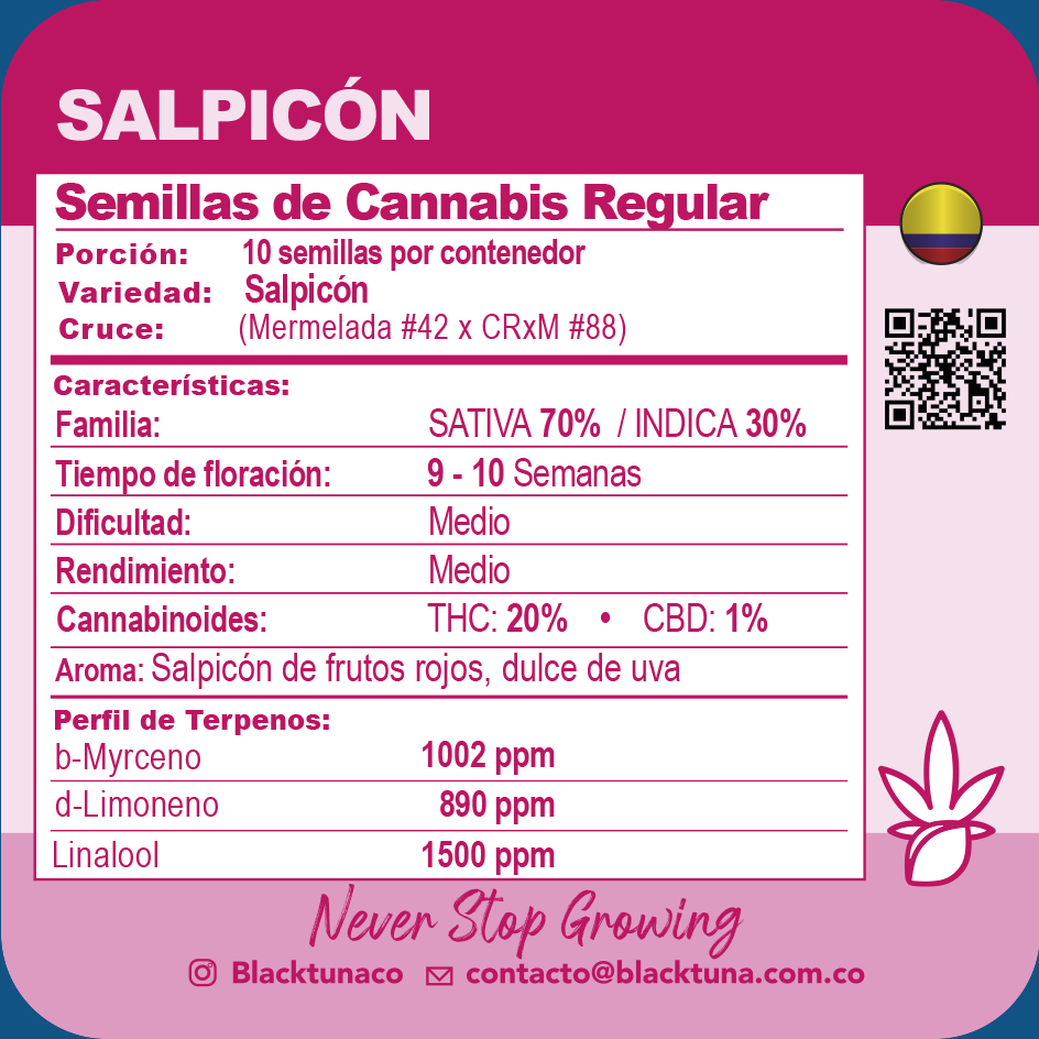 Bienvenidos a Colombia, el llamado “País De Las Frutas”!. Black Tuna Seeds tiene orgullo de presentar una de las joyas más esperadas de la nueva Línea Nativa: la inigualable Salpicón. Nuestra selección de mermelada fenotipo Sparkies de Uva fue utilizado para este cruce ya que que le aporta hermosos matices frutales al ya famoso cuerpo de la Colombiana Rosada x Mazar.