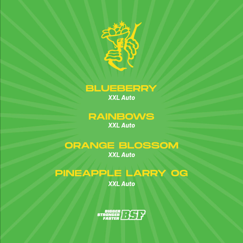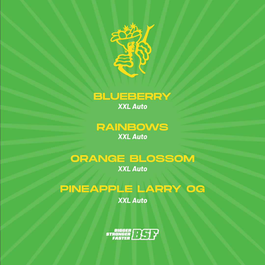 Tutti Frutti XXL Auto Mix es una explosión de sabor de 4 de las variedades más frutales de BSF Seeds en su versión automática; Auto Blueberry, Auto Rainbows, Auto Orange Blossom y Auto Pineapple Larry OG. Una increíble mezcla de terpenos separados en burbujas independientes.